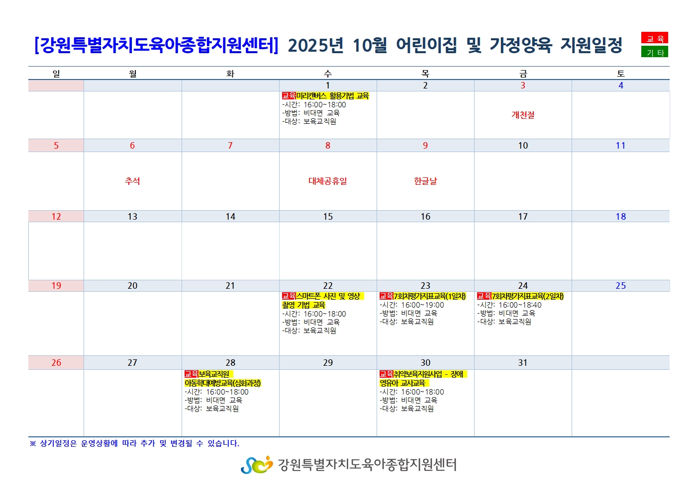 [강원육아종합지원센터]2025년 10월 어린이집 및 가정양육 지원 일정.jpg