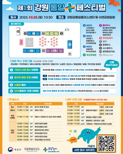1. 강원권 통일플러스센터는 지역사회와 함께하는 통일분야 종합플랫폼으로서 통일부와 강원특별자치도가 통일 기반 구축 및 공감대 확산을 목적으로 운영하고 있습니다. 2. 또한 지역사회 내 참여와 관심을 확대하기 위하여 강원권통일플러스센터 개관 1주년 기념행사를 개최하여 센터에서 운영하는 통일교육 프로그램 및 센터의 인지도를 높이고, 지역사회와의 연계를 강화하고자 합니다. 《 강원권 통일플러스센터 개관 1주년 기념행사》 ▹ 일 시 : 2025. 10. 25.(토) 10:30~17:00 ▹ 장 소 : 강원권 통일플러스센터(춘천수변공원 일대) ▹ 참석대상 : 주요내빈 10명 내외, 관계기관, 강원도민(가족단위 등) ▹ 주요내용 : 개회사 및 축사, 축하공연, 체험부스, 부대행사, 명사초청특강 등 붙임 1. 행사개요(대외) 1부. 2. 1주년기념포스터 각 1부. 끝.